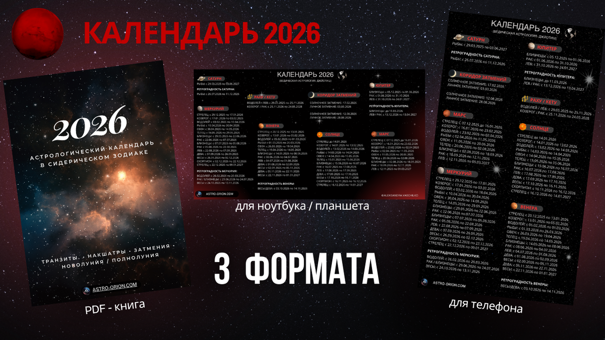 Календарь содержит в себе даты ключевых астрологических событий 2026 года. Новолуния, полнолуния, коридоры затмений. переход Солнца, меркурия, венеры, марса, юпитера, сатурна, раху и кету в другие знаки и накшатры (лунные стоянки / созвездия).